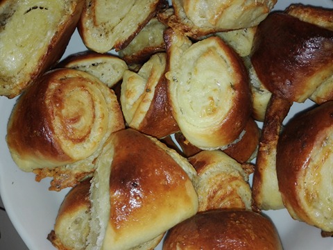 Először az élesztőt cukros tejben felfuttatom, majd fél csomag margarinnal és a többi hozzávalóval (kivéve sajt) összegyúrjuk. 1 órán át kelesztjük,míg a duplája nem lesz. Közben a margarin másik felét a reszelt sajtokkal kikavarjuk, ízlés szerint fűszerezzük (só, bors, zöld fűszerek).